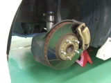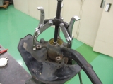 | プーラーを使用して、ハブをナックルから取り外します。これは結構硬い!!ハブが外れたら、ナックルからブレーキダストカバーを取り外しておきます。 | |