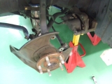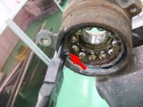 | まずはローター、ブレーキキャリパー、スピードセンサーを外し、アッパーアーム、ロアアームを切り離して、ステアリングナックルを付けたまま、ハブを取り外します。 | |
