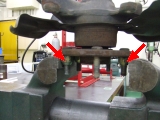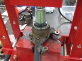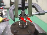 インナー側から、プレス機を使用してナックルからベアリングを抜きます。これもえらく硬かった! |