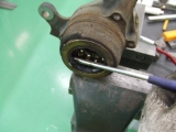 | 次にナックルに圧入されているオイルシールをマイナスのドライバーで抜きます。 | |